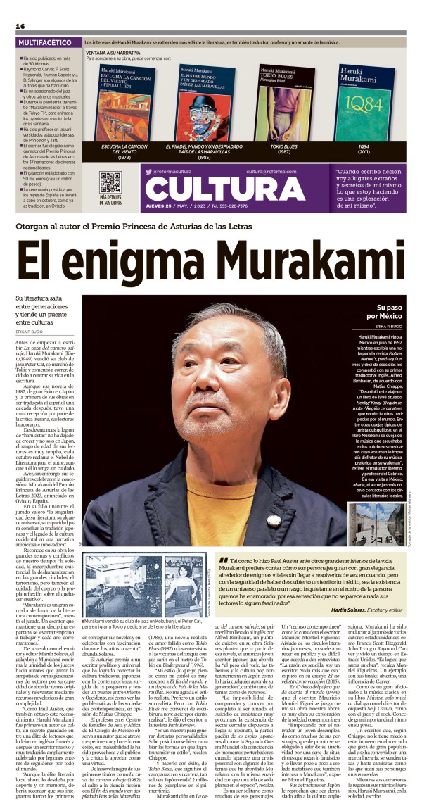 Me entrevistaron para el periódico Reforma a propósito del Premio Princesa de Asturias en Letras que recibió esta semana Murakami Haruki.