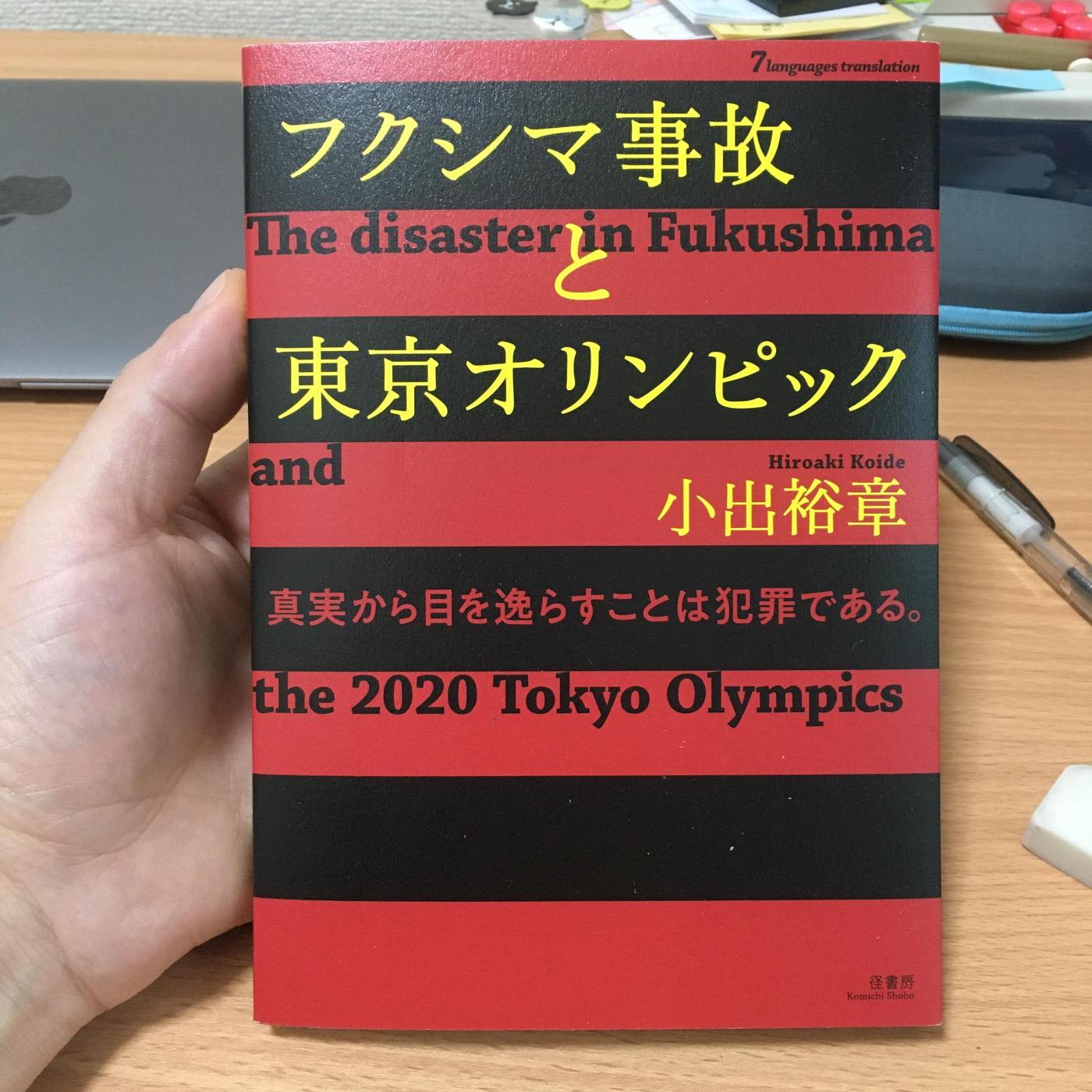 La editorial Komichi Shobo me envío de regalo un ejemplar del recién salido 『フクシマ事故と東京オリンピック』(Fukushima jiko to tōkyō orinpikku) de Hiroaki Koide. Se trata de un libro que denuncia el uso mediático de las Olimpiadas 2020 para esconder o tapar el desastre ocurrido en Fukushima en 2011, cuyas consecuencias aún persisten. A fin de que el mensaje se transmita al mayor público posible, el libro incluye parte en siete idiomas (inglés, español, francés, alemán, ruso, chino y árabe) originalmente escritos por el autor en japonés y traducidos por un equipo de traductores. Yo fui el encargado de los fragmentos en español. Las casualidades de la vida han querido que acumule otra traducción en el campo de las obras con denuncias político-ecológicas. Me alegra también haber quedado en contacto con la editorial. Y tengo que admitir que las imágenes del libro son geniales.