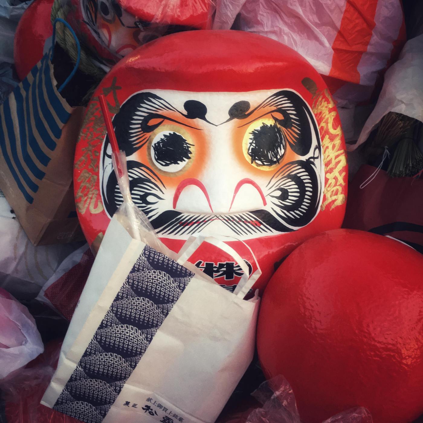 Pero eso no es todo. Ese mismo día se celebra en todo Japón el día conocido como kagami biraki (鏡開き, apertura de los espejos), que simboliza la ruptura con una larga abstinencia o represión. Y como durante cualquier evento festivo, y en ese caso doble, había en a calle todo tipo de puestitos que vendían comida de matsuri, juguetes, ropa y parafernalia religiosa, como son los daruma. Éstos son unos muñecos huecos, redondos y hechos a manos, pero cuyos ojos nunca están pintados. La persona debe, al momento de adquirir un daruma, pedir un deseo y dibujar su ojo izquierdo; al momento en que el deseo se cumpla, debe pintar el otro ojo y abandonar el muñeco en algún santuario o festival.