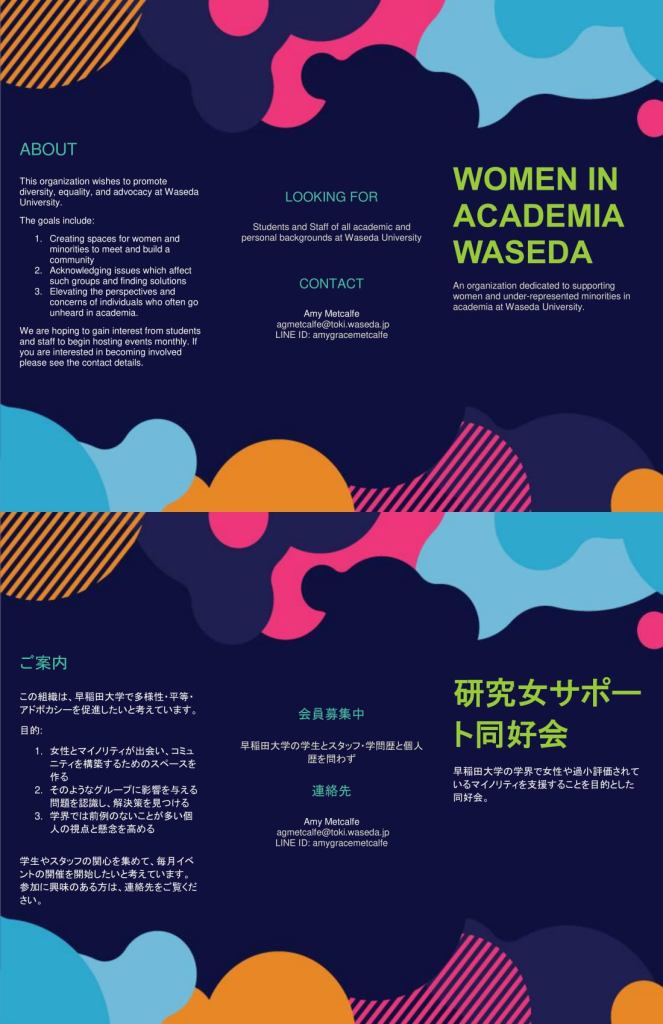Women in Academia 早稲田大学に所属する皆さんへ間も無く早稲田大学の研究女サポート同好会が立ち上げられます。参加したり協力したければ以下のメールにお書きください。宜しくお願いします! Comparte esto: Haz clic para compartir en Facebook (Se abre en una ventana nueva) Facebook Haz clic para enviar un enlace por correo electrónico a un amigo (Se abre en una ventana nueva) Correo electrónico Haz clic para compartir en Telegram (Se abre en una ventana nueva) Telegram Haz clic para compartir en WhatsApp (Se abre en una ventana nueva) WhatsApp Haz clic para compartir en X (Se abre en una ventana nueva) X Me gusta Cargando... Relacionado Deja un comentario Cancelar la respuesta