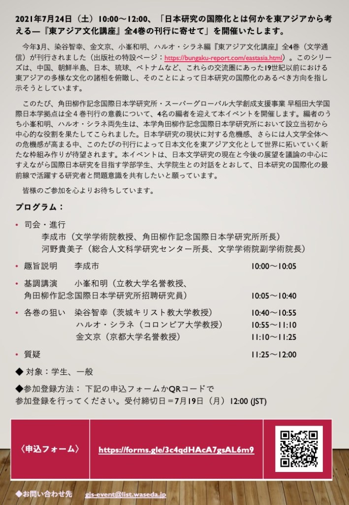 ワークショップ 国際日本学 早稲田大学の文学学術院ではワークショップ「日本研究の国際化とは何かを東アジアから考える―『東アジア文化講座』全4巻の刊行に寄せて」2021年7月24日(土)10:00~12:00に早稲田大学戸山キャンパス33号館3階第⼀会議室&オンラインを開催いたします。本イベントは、日本文学研究の現在と今後の展望を議論の中心にすえながら、国際日本研究を目指す学部学生、大学院生との対話をとおして、日本研究の国際化の最前線で活躍する研究者と問題意識を共有したいと願っています。 Comparte esto: Haz clic para compartir en Facebook (Se abre en una ventana nueva) Facebook Haz clic para enviar un enlace por correo electrónico a un amigo (Se abre en una ventana nueva) Correo electrónico Haz clic para compartir en Telegram (Se abre en una ventana nueva) Telegram Haz clic para compartir en WhatsApp (Se abre en una ventana nueva) WhatsApp Haz clic para compartir en X (Se abre en una ventana nueva) X Me gusta Cargando... Relacionado Deja un comentario Cancelar la respuesta