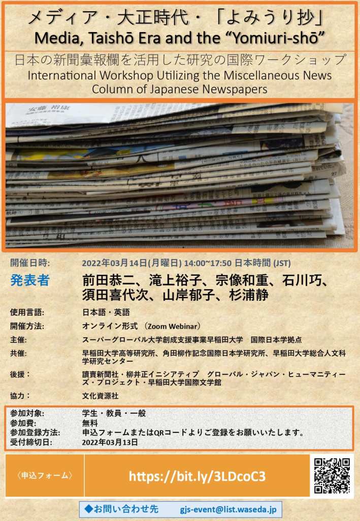Let me invite you all to this event we’ll be hosting about the Yomiuri Shimbun’s Literary Column. I learned so much as an SGU researcher coordinating these events. I hope I can soon apply that knowledge in other contexts as well!「読売新聞のよみうり抄」について、早稲田大学文学学術院で開催される下記の発表会に招待したいと思います! オンライン配信され、申込フォーム又はQRコードよりご登録してください。