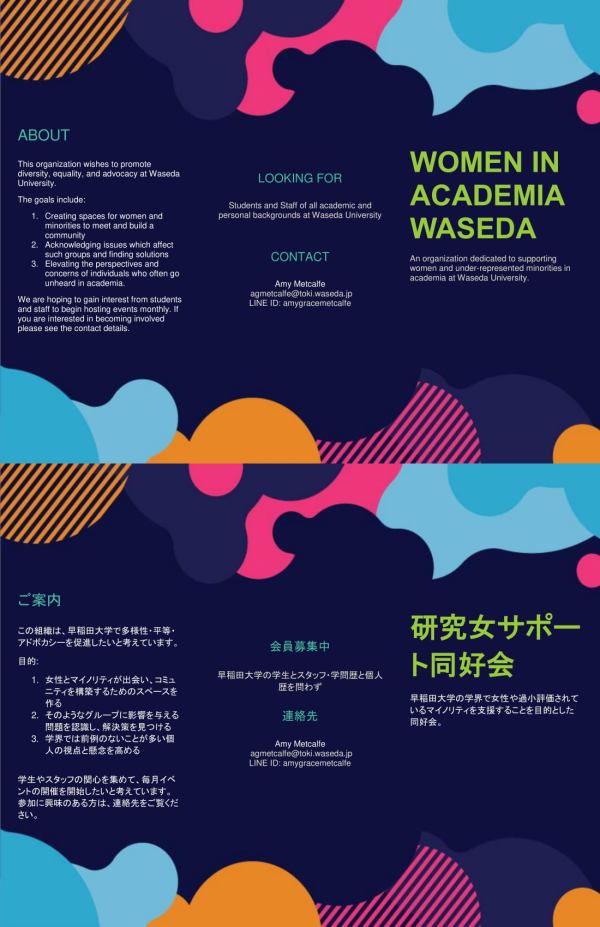 早稲田大学に所属する皆さんへ間も無く早稲田大学の研究女サポート同好会が立ち上げられます。参加したり協力したければ以下のメールにお書きください。宜しくお願いします!